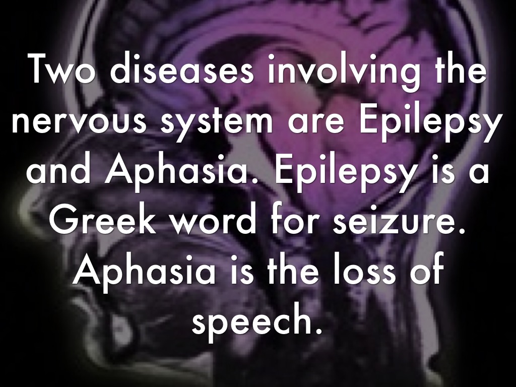 Two diseases involving the nervous system are Epilepsy and Aphasia. Epilepsy is a Greek word for seizure. Aphasia is the loss of speech.