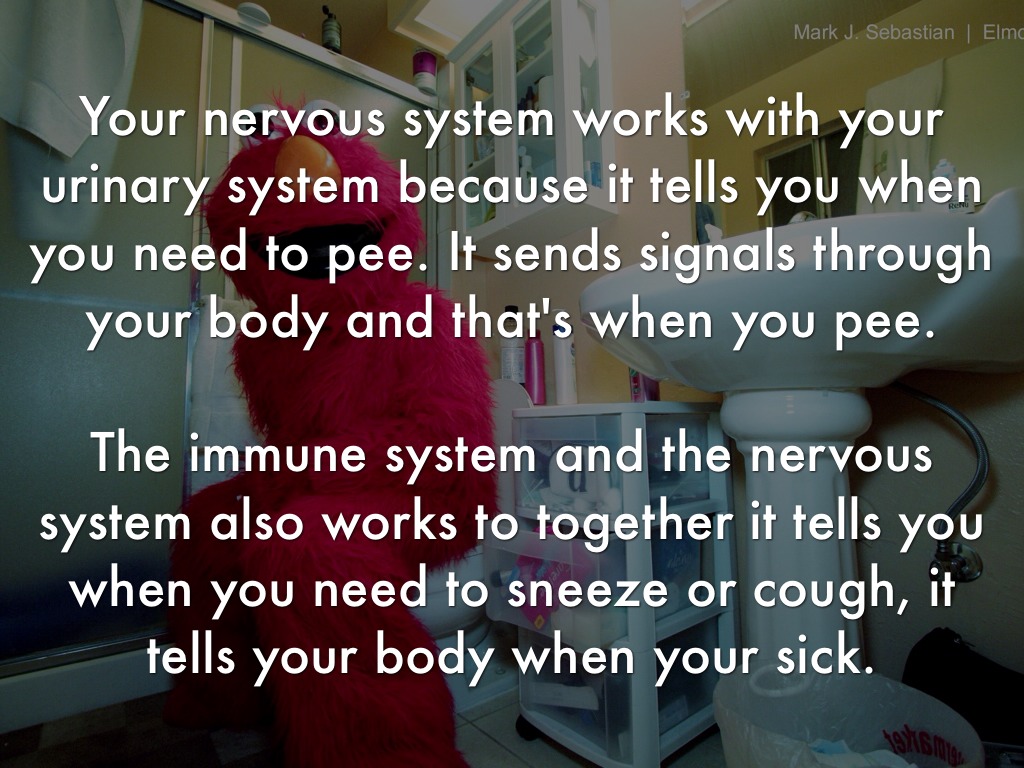 Your nervous system works with your urinary system because it tells you when you need to pee. It sends signals through your body and that's when you pee.