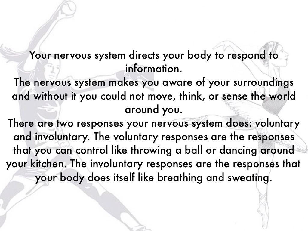 There are two responses your nervous system does: voluntary and involuntary. The voluntary responses are the responses that you can control like throwing a ball or dancing around your kitchen. The involuntary responses are the responses that your body does itself like breathing and sweating.