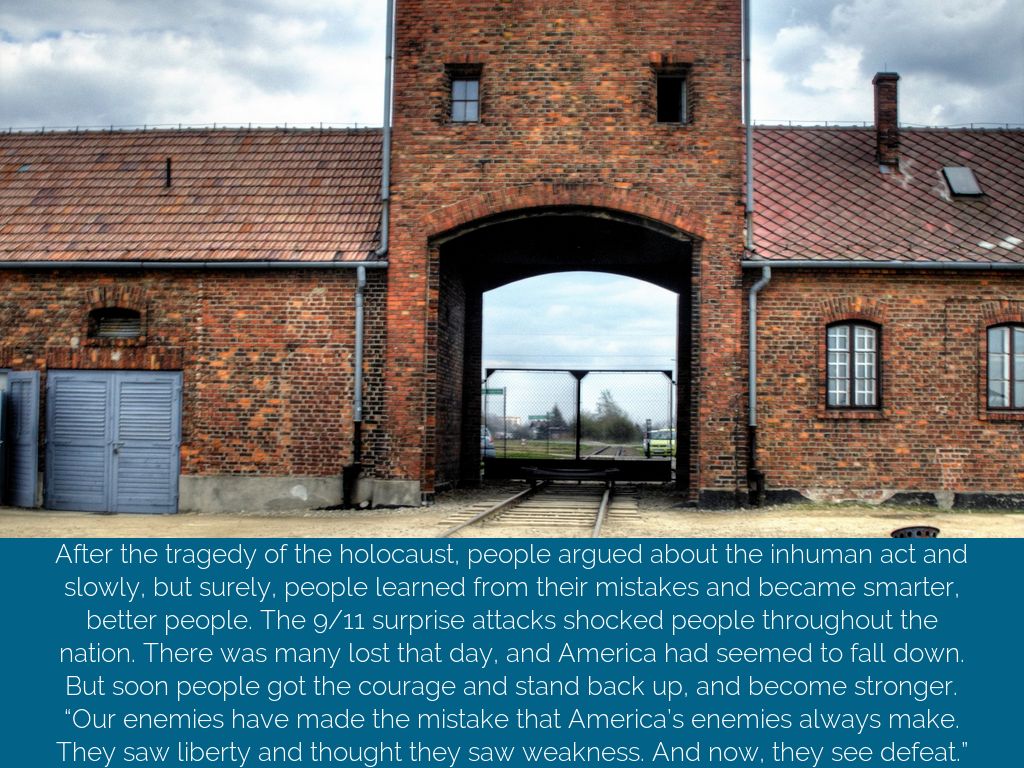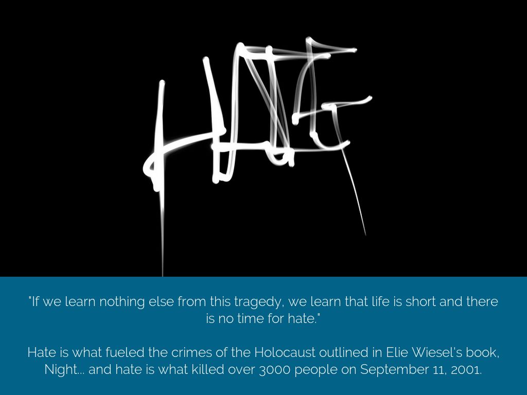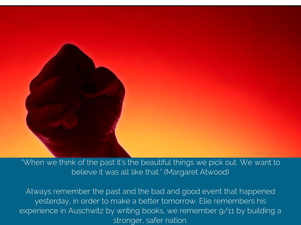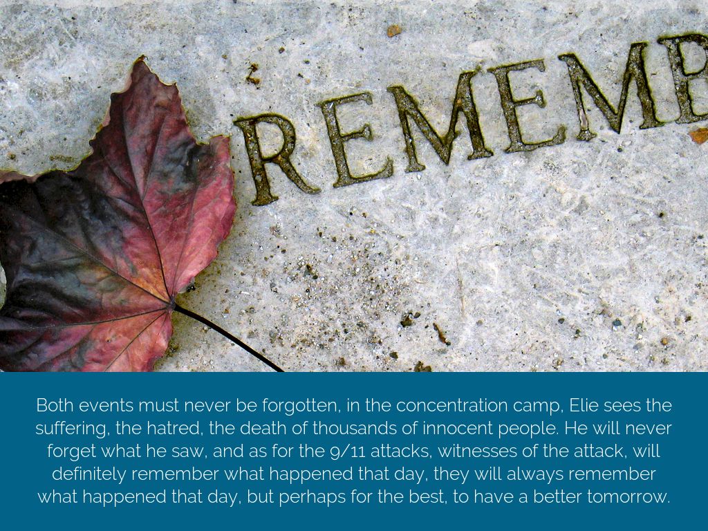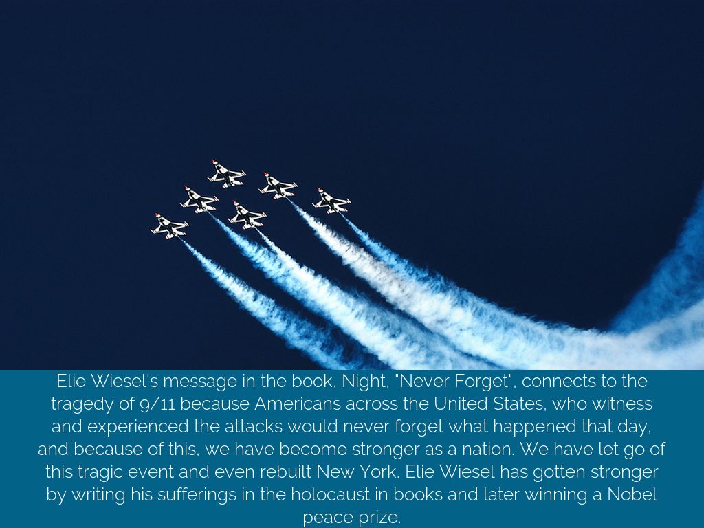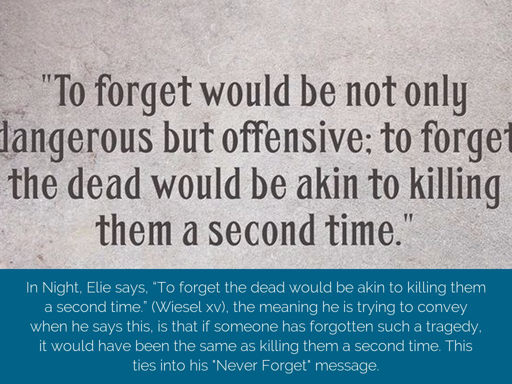 In Night, Elie says, “To forget the dead would be akin to killing them a second time.” (Wiesel xv), the meaning he is trying to convey when he says this, is that if someone has forgotten such a tragedy, it would have been the same as killing them a second time. This ties into his "Never Forget" message.