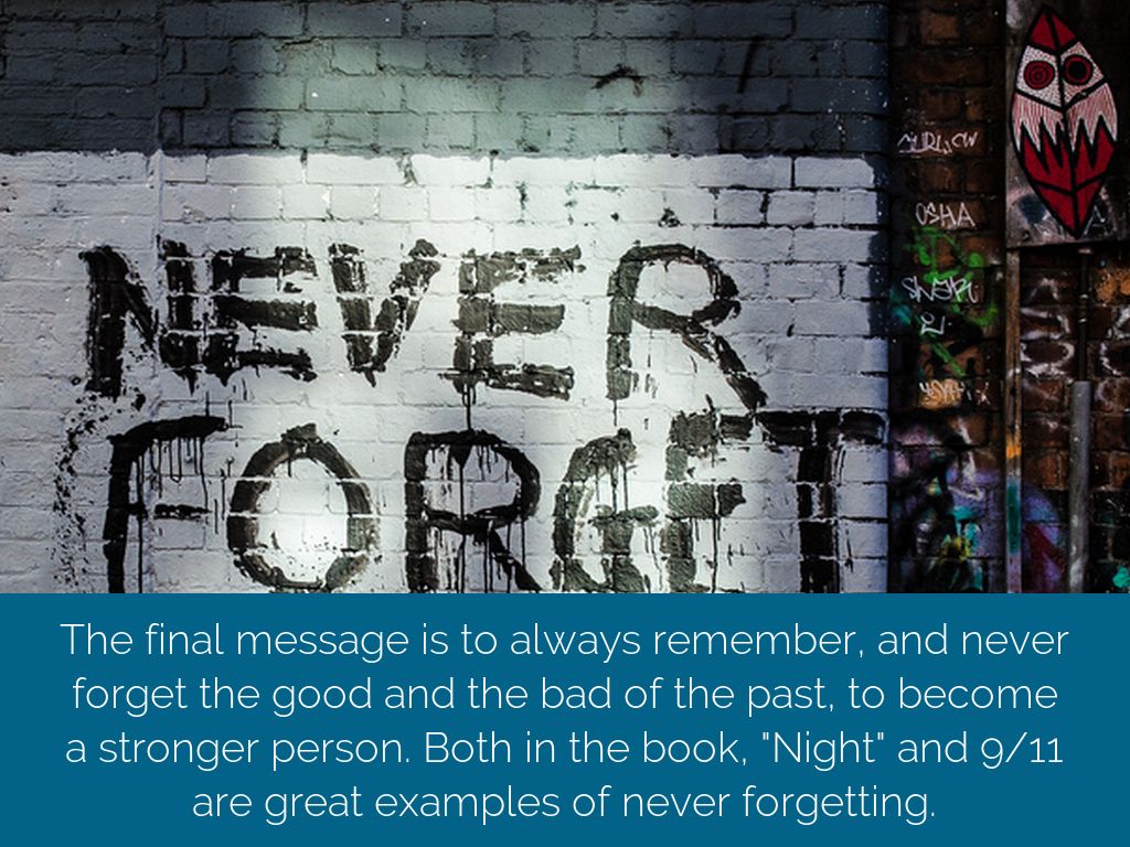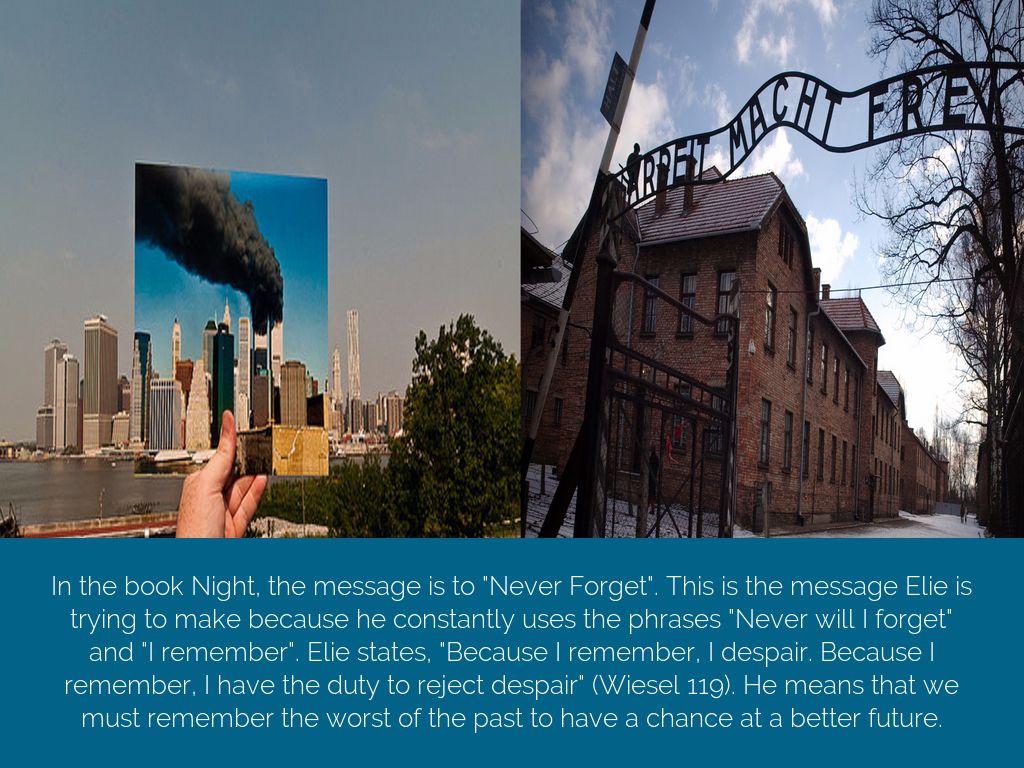 In the book Night, the message is to "Never Forget". This is the message Elie is trying to make because he constantly uses the phrases "Never will I forget" and "I remember". Elie states, "Because I remember, I despair. Because I remember, I have the duty to reject despair" (Wiesel 119). He means that we must remember the worst of the past to have a chance at a better future.
