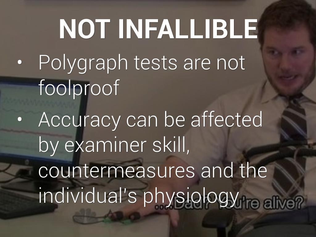 - Accuracy can be affected by examiner skill, countermeasures and the individual’s physiology