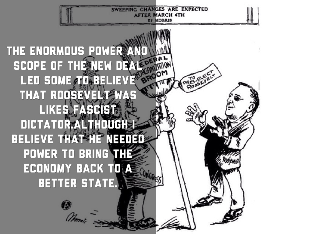 The enormous power and scope of the new deal led some to believe that Roosevelt was likes fascist dictator.although I believe that he needed power to bring the economy back to a better state.