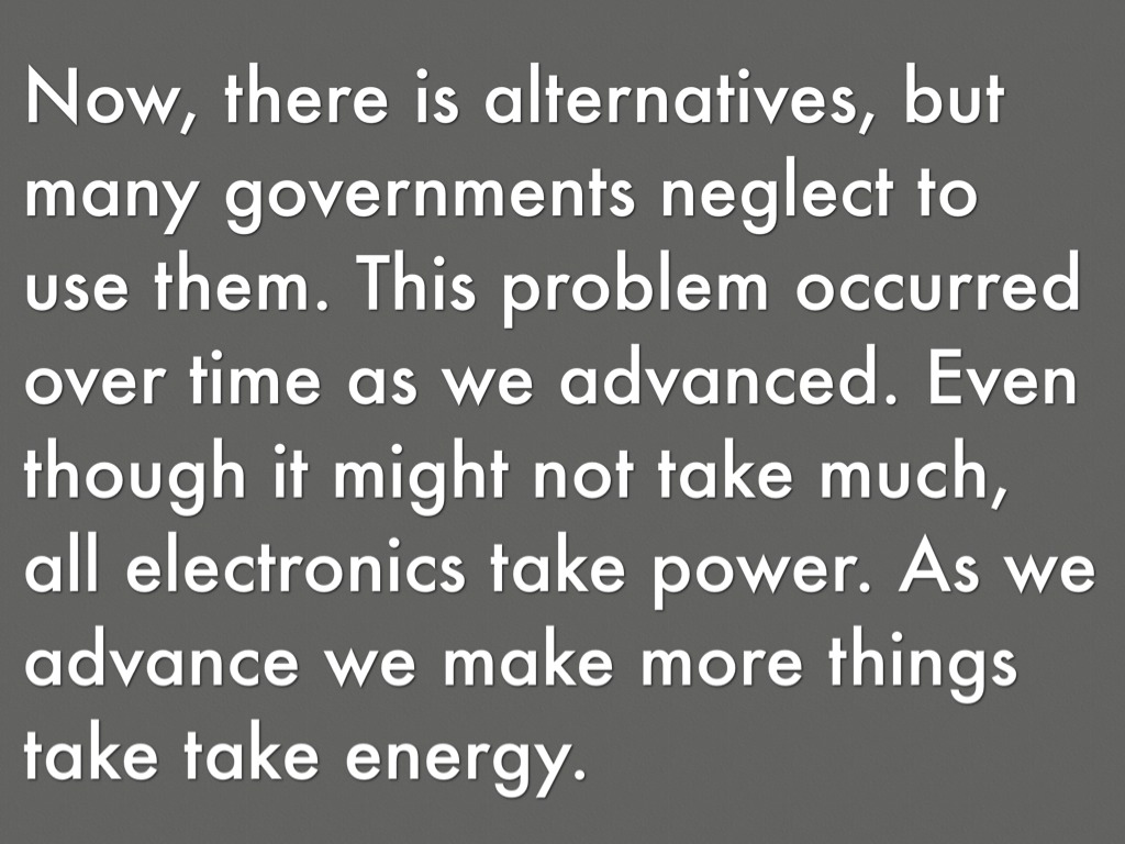 Now, there is alternatives, but many governments neglect to use them. This problem occurred over time as we advanced. Even though it might not take much, all electronics take power. As we advance we make more things take take energy.