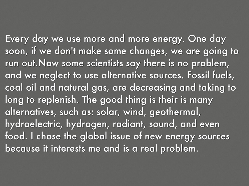 Every day we use more and more energy. One day soon, if we don't make some changes, we are going to run out.Now some scientists say there is no problem, and we neglect to use alternative sources. Fossil fuels, coal oil and natural gas, are decreasing and taking to long to replenish. The good thing is their is many alternatives, such as: solar, wind, geothermal, hydroelectric, hydrogen, radiant, sound, and even food. I chose the global issue of new energy sources because it interests me and is a real problem.