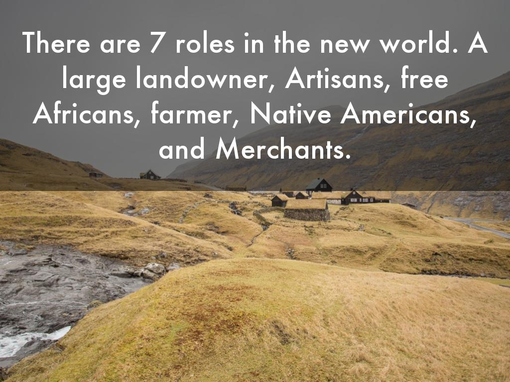 There are 7 roles in the new world. A large landowner, Artisans, free Africans, farmer, Native Americans, and Merchants.