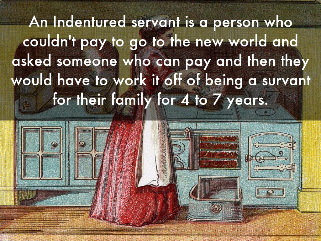 An Indentured servant is a person who couldn't pay to go to the new world and asked someone who can pay and then they would have to work it off of being a survant for their family for 4 to 7 years.