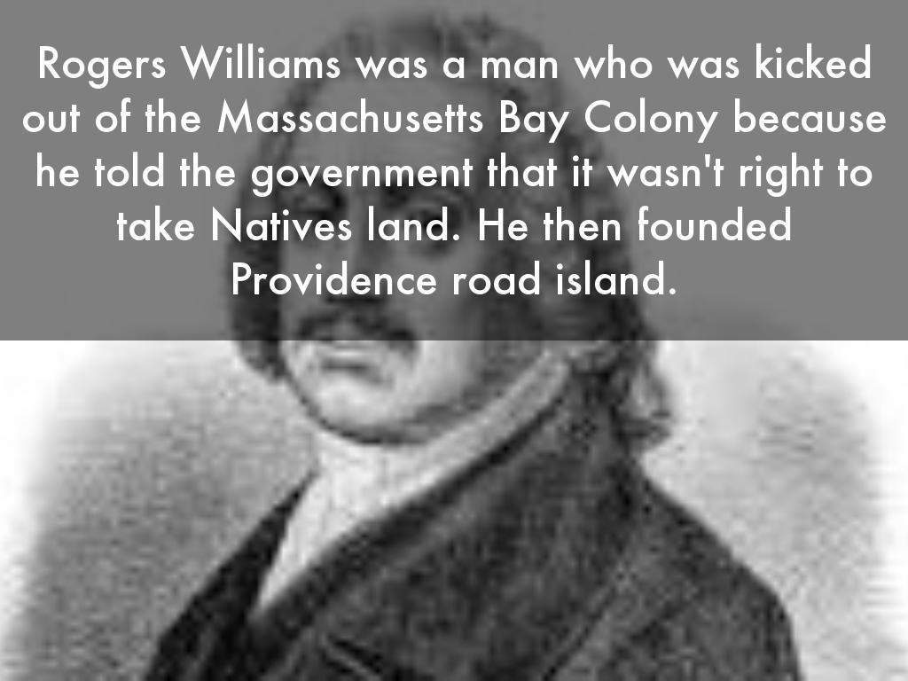 Rogers Williams was a man who was kicked out of the Massachusetts Bay Colony because he told the government that it wasn't right to take Natives land. He then founded Providence road island.