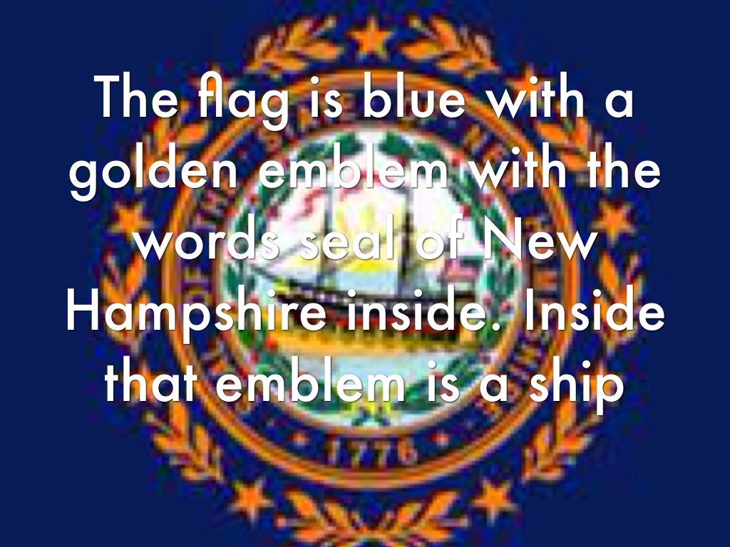 The flag is blue with a golden emblem with the words seal of New Hampshire inside. Inside that emblem is a ship