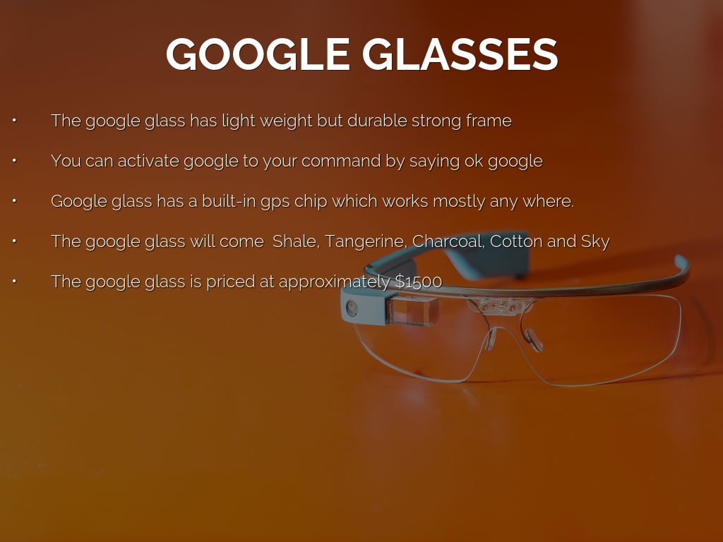 • The google glass will come  Shale, Tangerine, Charcoal, Cotton and Sky