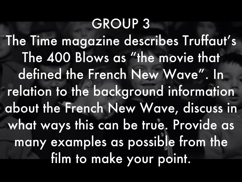 The Time magazine describes Truffaut’s The 400 Blows as “the movie that defined the French New Wave”. In relation to the background information about the French New Wave, discuss in what ways this can be true. Provide as many examples as possible from the film to make your point.