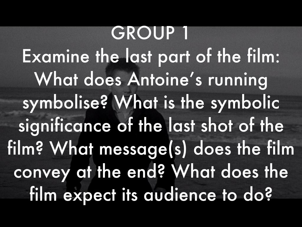 Examine the last part of the film: What does Antoine’s running symbolise? What is the symbolic significance of the last shot of the film? What message(s) does the film convey at the end? What does the film expect its audience to do?