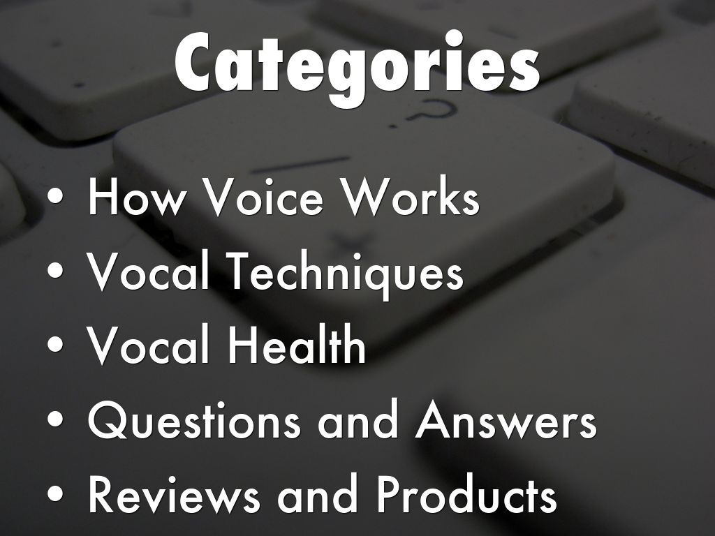 The website has several categories, including sections about vocal mechanism, vocal techniques, vocal health, common questions new singers may have and recommended products for singers.