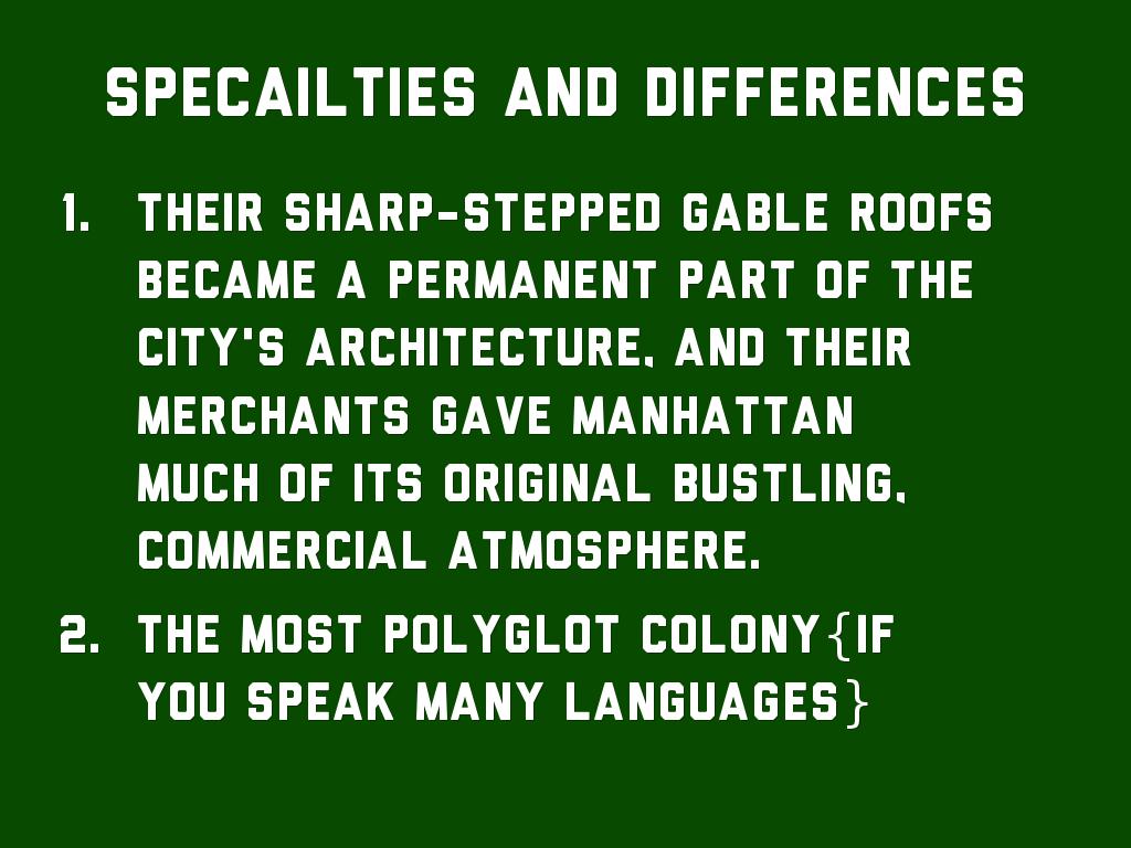 Their sharp-stepped gable roofs became a permanent part of the city's architecture, and their merchants gave Manhattan much of its original bustling, commercial atmosphere.