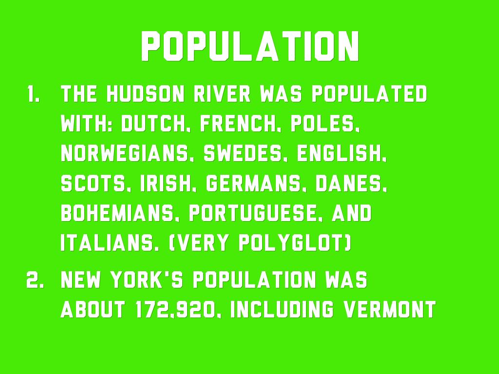 The Hudson River was populated with: Dutch, French, Poles, Norwegians, Swedes, English, Scots, Irish, Germans, Danes, Bohemians, Portuguese, and Italians. (very polyglot)