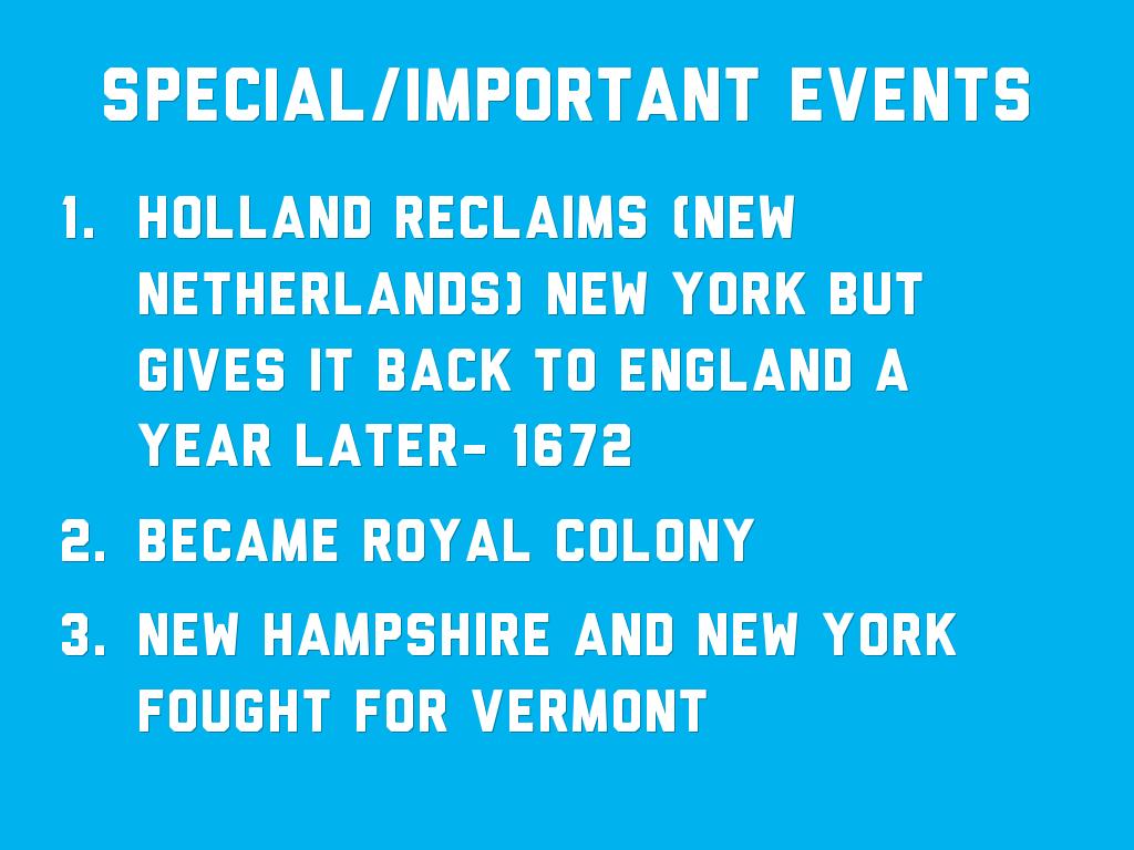 Holland reclaims (New Netherlands) New York but gives it back to England a year later- 1672