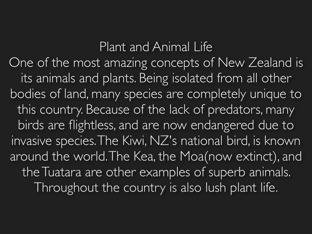 One of the most amazing concepts of New Zealand is its animals and plants. Being isolated from all other bodies of land, many species are completely unique to this country. Because of the lack of predators, many birds are flightless, and are now endangered due to invasive species. The Kiwi, NZ's national bird, is known around the world. The Kea, the Moa(now extinct), and the Tuatara are other examples of superb animals. Throughout the country is also lush plant life.