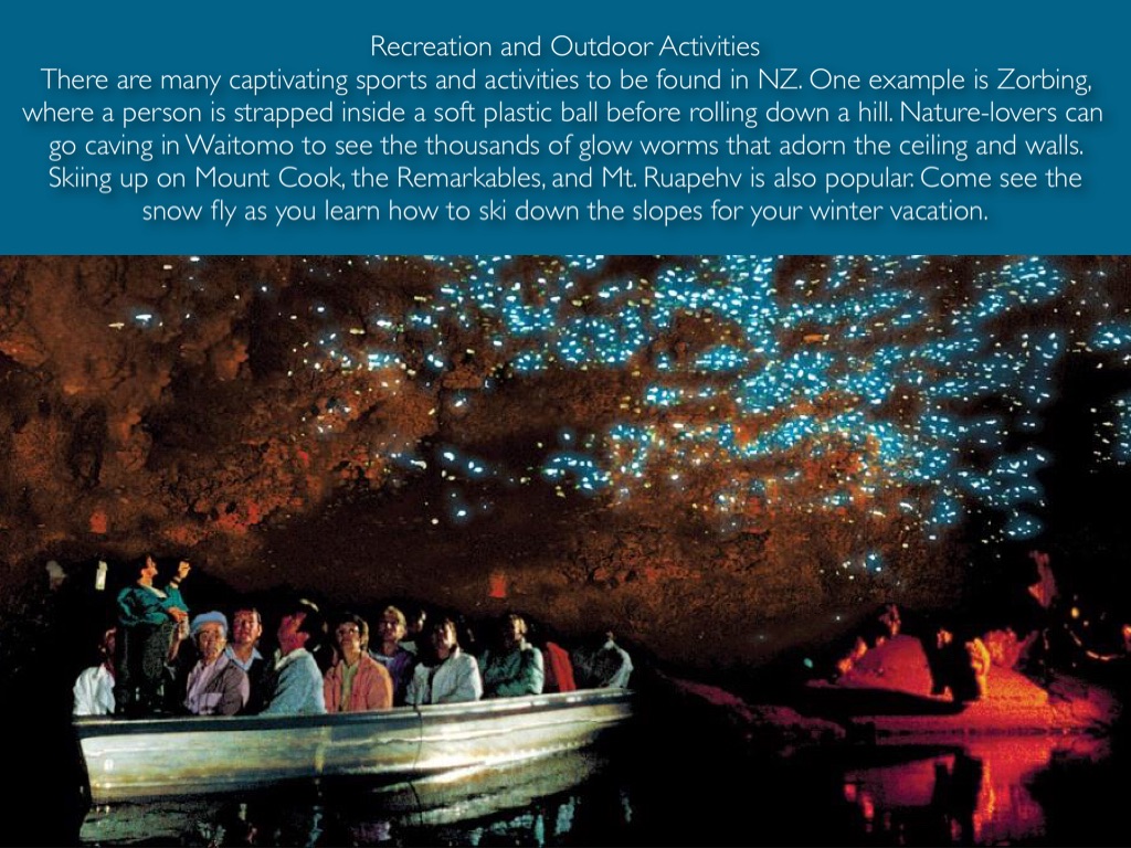 There are many captivating sports and activities to be found in NZ. One example is Zorbing, where a person is strapped inside a soft plastic ball before rolling down a hill. Nature-lovers can go caving in Waitomo to see the thousands of glow worms that adorn the ceiling and walls. Skiing up on Mount Cook, the Remarkables, and Mt. Ruapehv is also popular. Come see the snow fly as you learn how to ski down the slopes for your winter vacation.