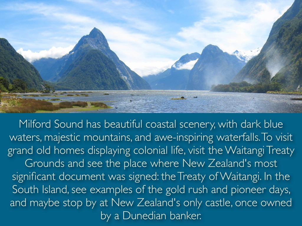 Milford Sound has beautiful coastal scenery, with dark blue waters, majestic mountains, and awe-inspiring waterfalls. To visit grand old homes displaying colonial life, visit the Waitangi Treaty Grounds and see the place where New Zealand's most significant document was signed: the Treaty of Waitangi. In the South Island, see examples of the gold rush and pioneer days, and maybe stop by at New Zealand's only castle, once owned by a Dunedian banker.