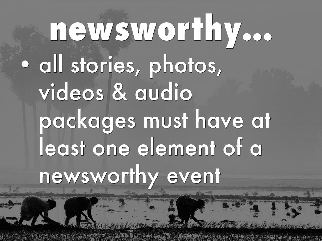 • all stories, photos, videos & audio packages must have at least one element of a newsworthy event