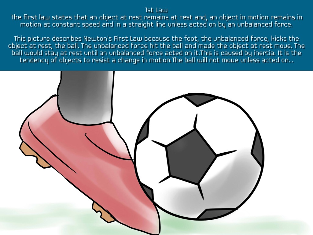This picture describes Newton's First Law because the foot, the unbalanced force, kicks the object at rest, the ball. The unbalanced force hit the ball and made the object at rest move. The ball would stay at rest until an unbalanced force acted on it.This is caused by inertia. It is the tendency of objects to resist a change in motion.The ball will not move unless acted on