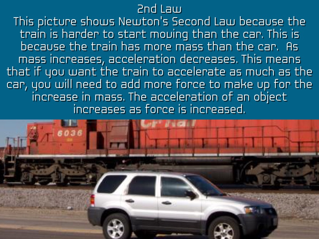 This picture shows Newton's Second Law because the train is harder to start moving than the car. This is because the train has more mass than the car. As mass increases, acceleration decreases. This means that if you want the train to accelerate as much as the car, you will need to add more force to make up for the increase in mass. The acceleration of an object increases as force is increased.