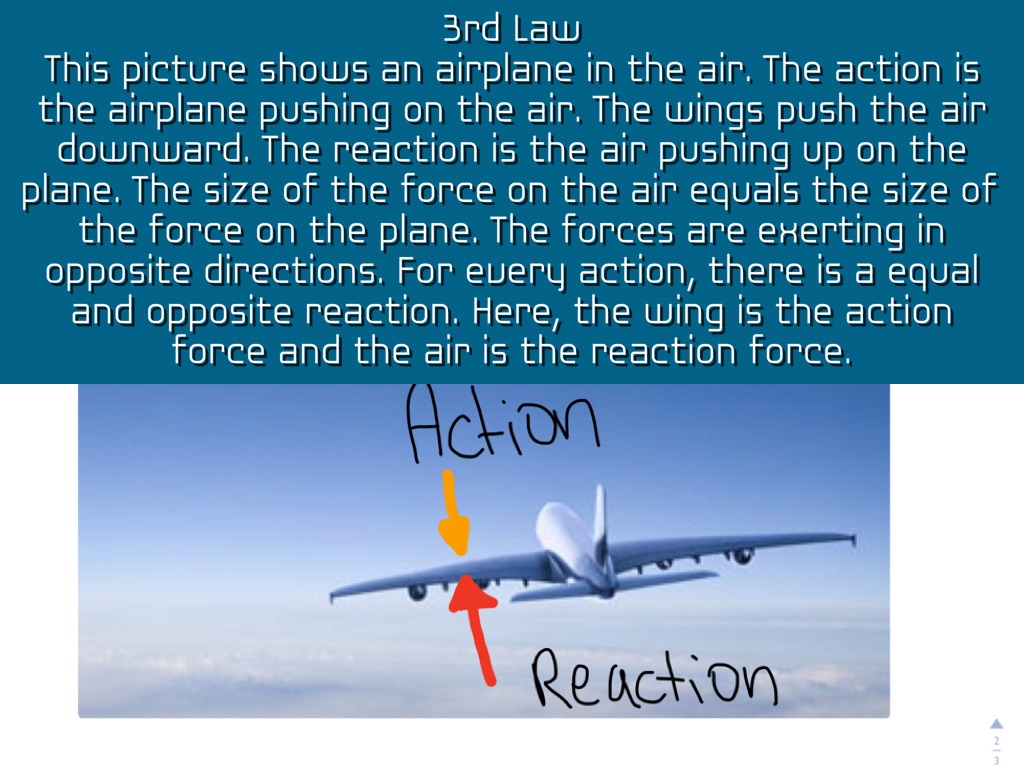 This picture shows an airplane in the air. The action is the airplane pushing on the air. The wings push the air downward. The reaction is the air pushing up on the plane. The size of the force on the air equals the size of the force on the plane. The forces are exerting in opposite directions. For every action, there is a equal and opposite reaction. Here, the wing is the action force and the air is the reaction force.