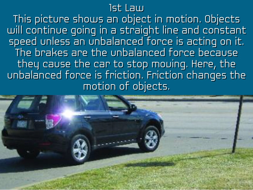 This picture shows an object in motion. Objects will continue going in a straight line and constant speed unless an unbalanced force is acting on it. The brakes are the unbalanced force because they cause the car to stop moving. Here, the unbalanced force is friction. Friction changes the motion of objects.