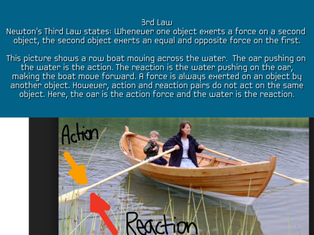 This picture shows a row boat moving across the water. The oar pushing on the water is the action. The reaction is the water pushing on the oar, making the boat move forward. A force is always exerted on an object by another object. However, action and reaction pairs do not act on the same object. Here, the oar is the action force and the water is the reaction.