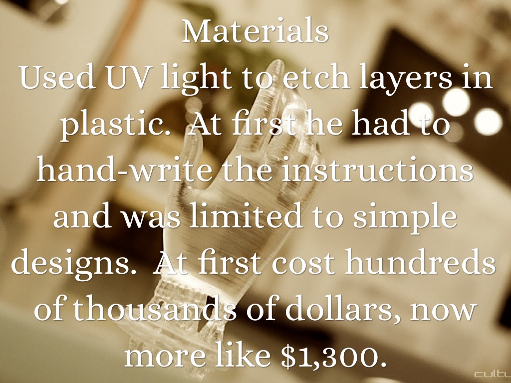 Used UV light to etch layers in plastic. At first he had to hand-write the instructions and was limited to simple designs. At first cost hundreds of thousands of dollars, now more like $1,300.