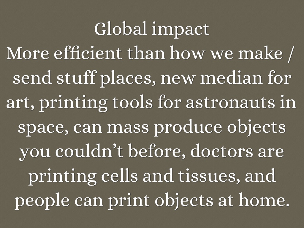 More efficient than how we make / send stuff places, new median for art, printing tools for astronauts in space, can mass produce objects you couldn’t before, doctors are printing cells and tissues, and people can print objects at home.