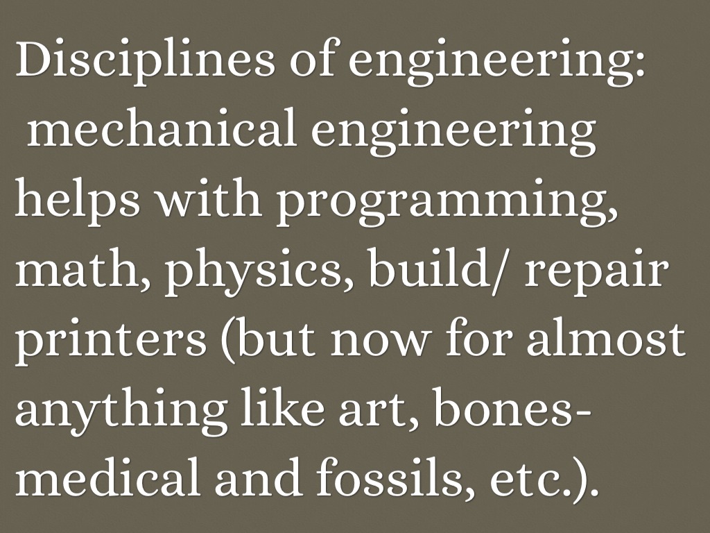 mechanical engineering helps with programming, math, physics, build/ repair printers (but now for almost anything like art, bones- medical and fossils, etc.).