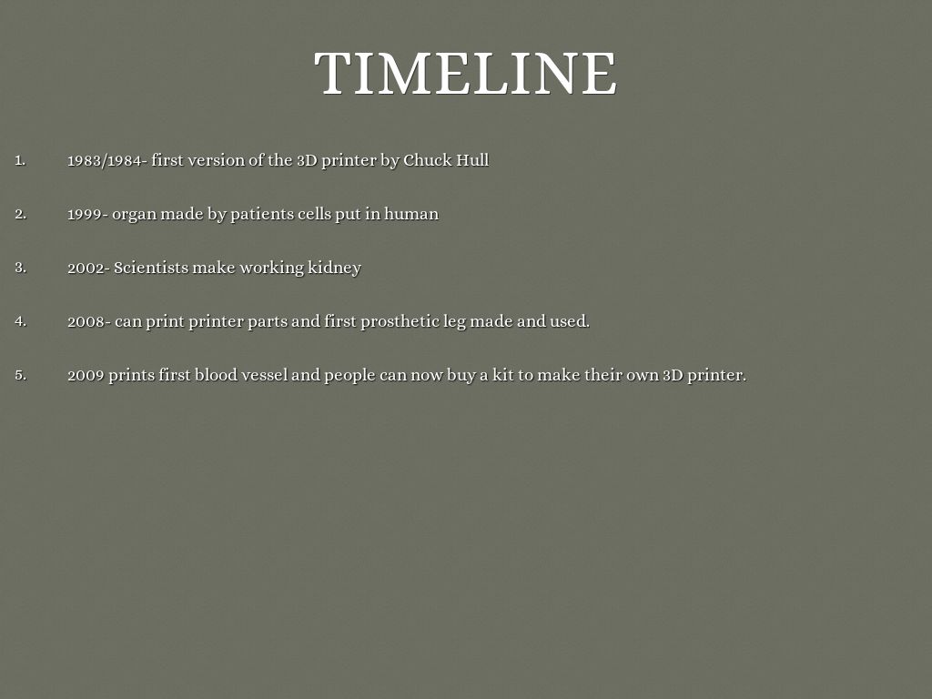 - 2009 prints first blood vessel and people can now buy a kit to make their own 3D printer.