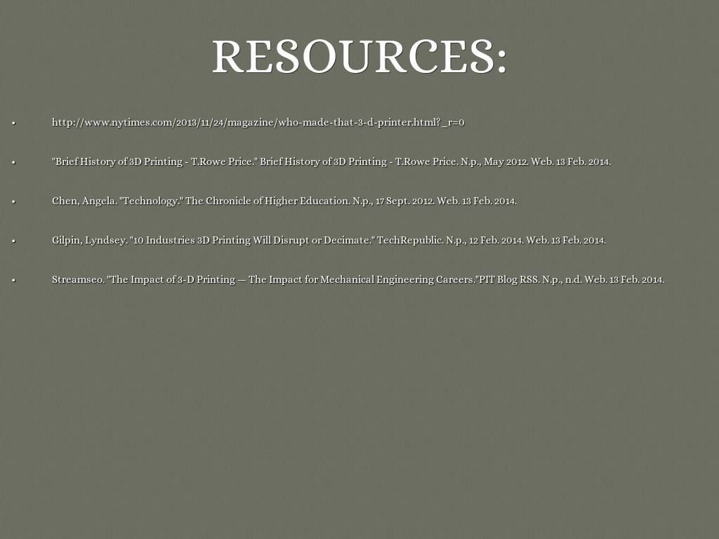- "Brief History of 3D Printing - T.Rowe Price." Brief History of 3D Printing - T.Rowe Price. N.p., May 2012. Web. 13 Feb. 2014.