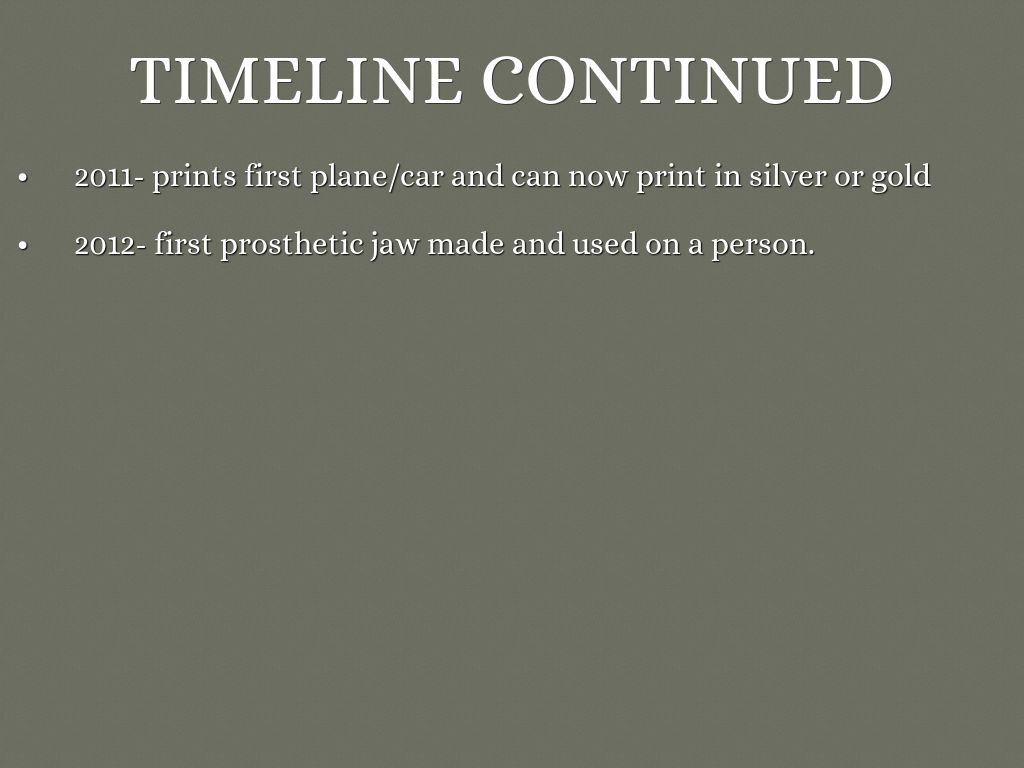 - 2008- can print printer parts and first prosthetic leg made and used.