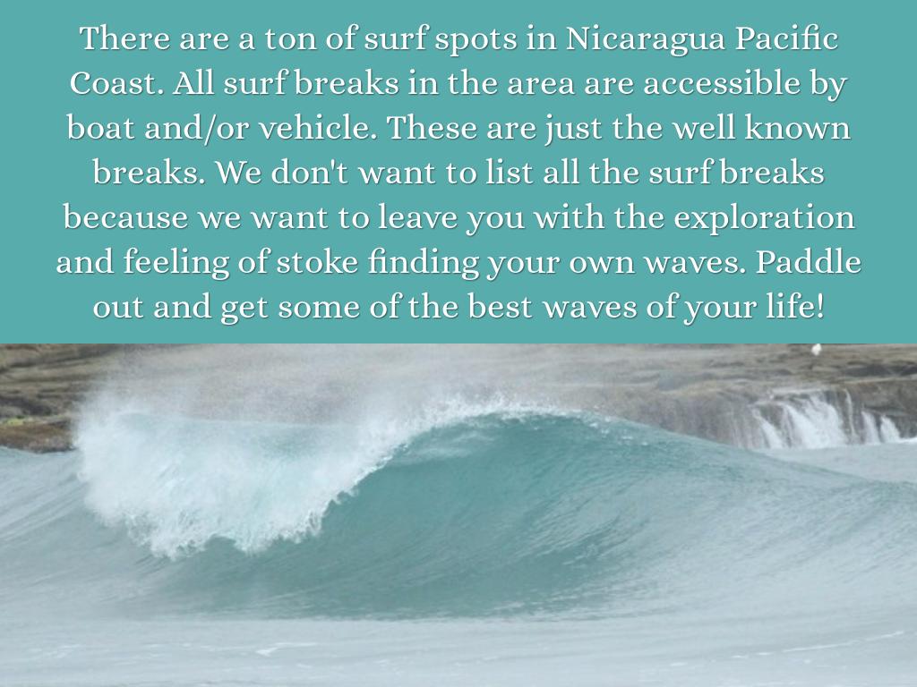There are a ton of surf spots in Nicaragua Pacific Coast. All surf breaks in the area are accessible by boat and/or vehicle. These are just the well known breaks. We don't want to list all the surf breaks because we want to leave you with the exploration and feeling of stoke finding your own waves. Paddle out and get some of the best waves of your life!