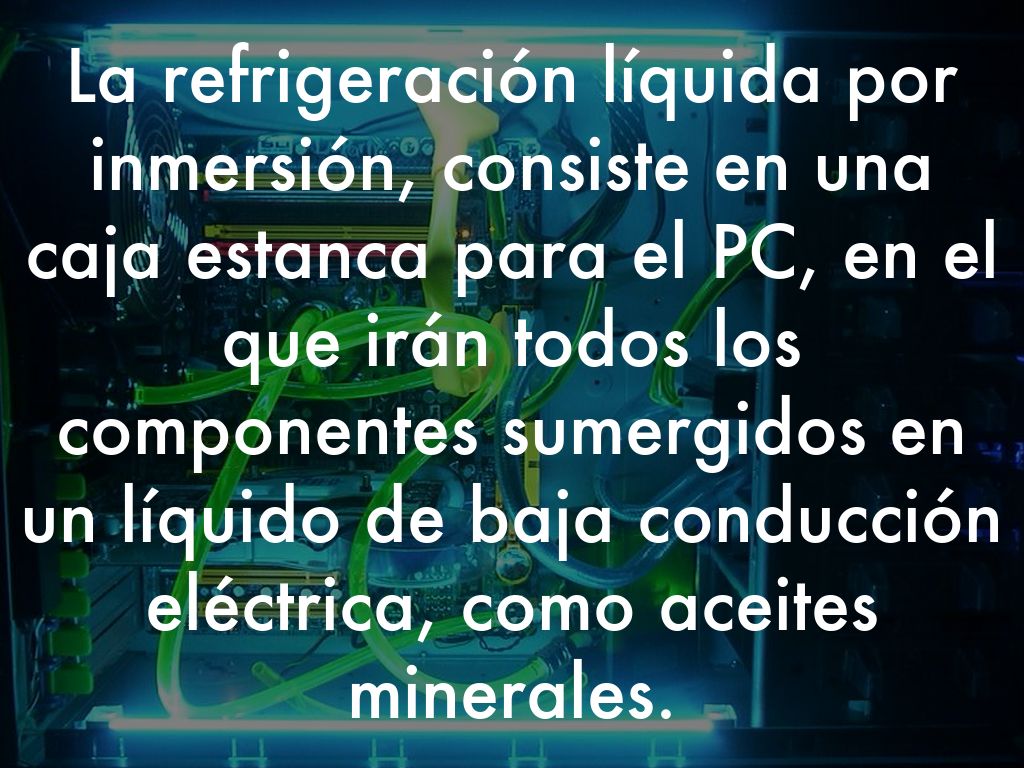 La refrigeración líquida por inmersión, consiste en una caja estanca para el PC, en el que irán todos los componentes sumergidos en un líquido de baja conducción eléctrica, como aceites minerales.