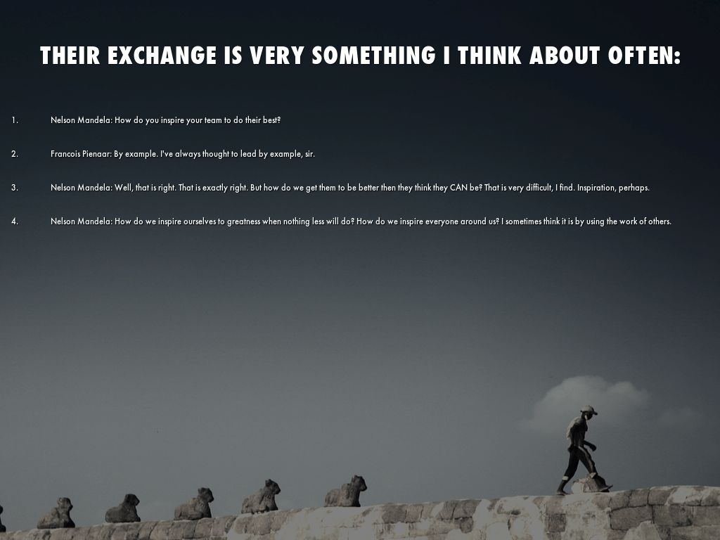 Nelson Mandela: How do we inspire ourselves to greatness when nothing less will do? How do we inspire everyone around us? I sometimes think it is by using the work of others.