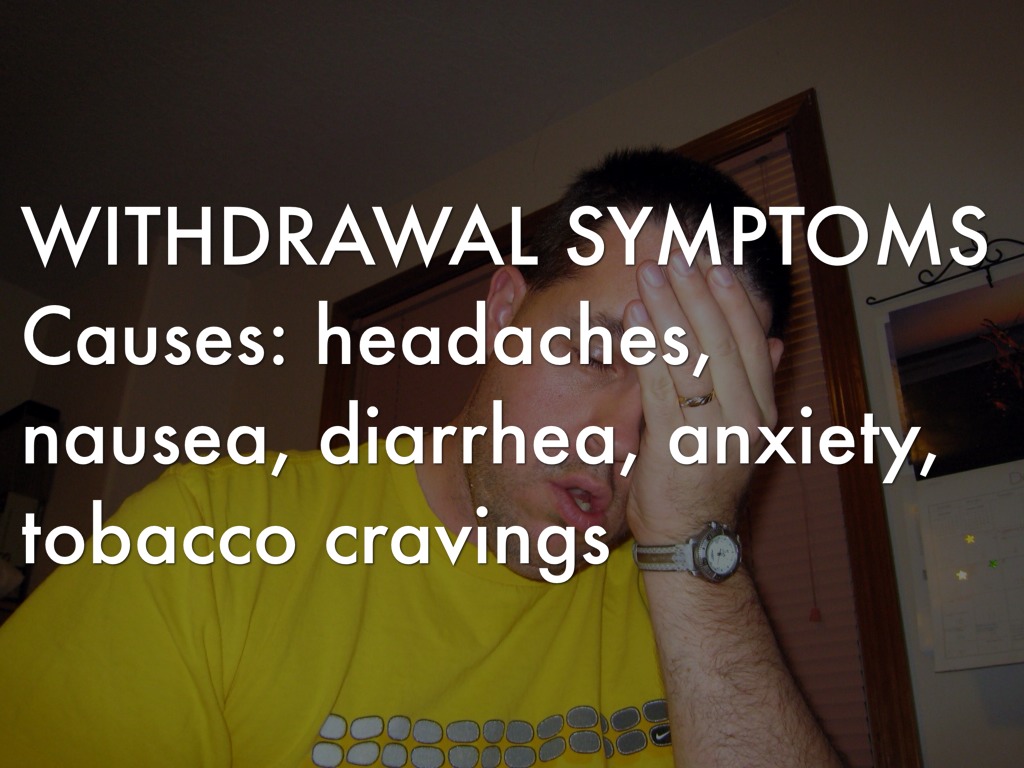 Causes: headaches, nausea, diarrhea, anxiety, tobacco cravings