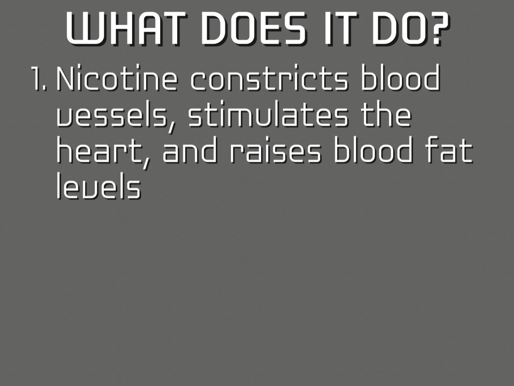 Nicotine constricts blood vessels, stimulates the heart, and raises blood fat levels