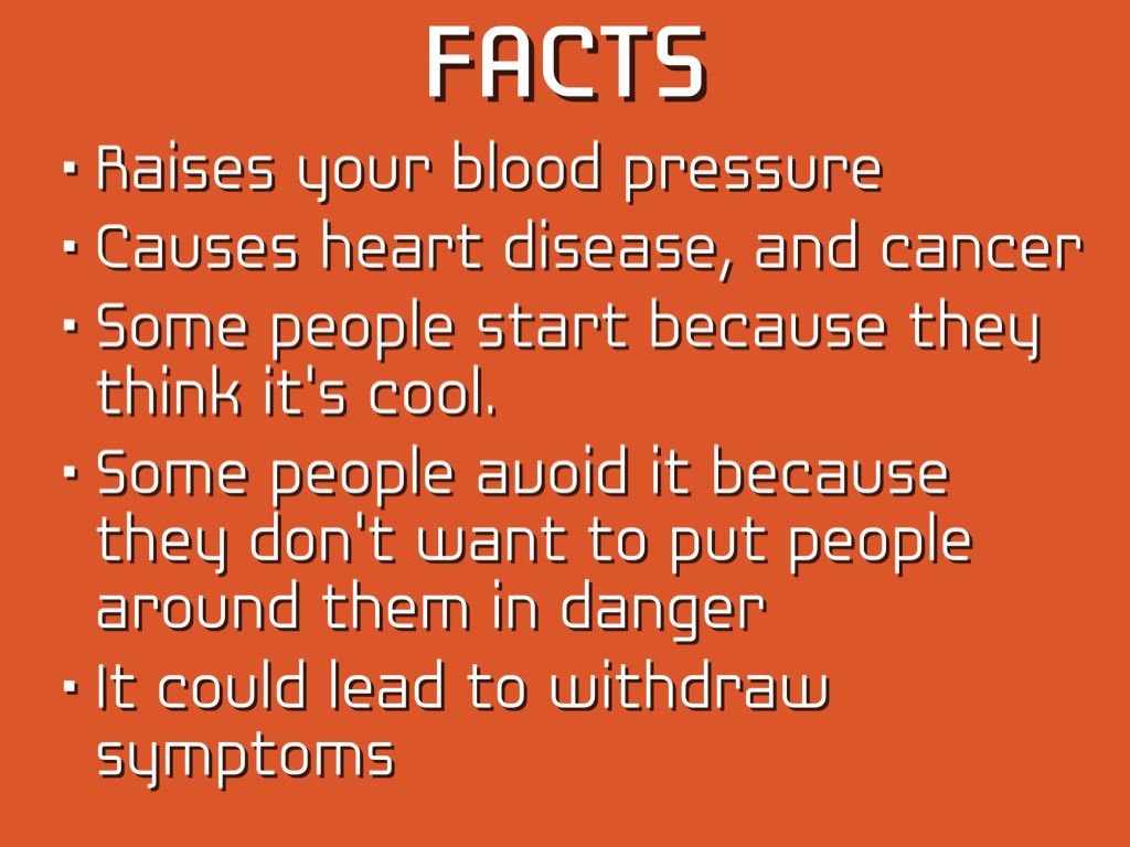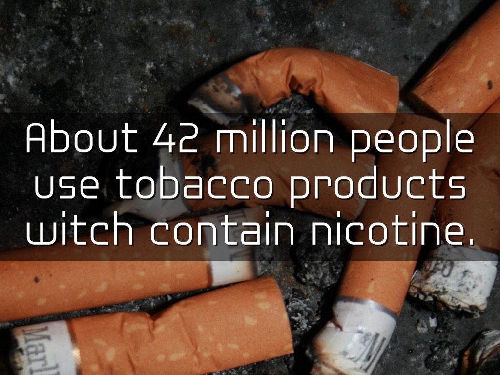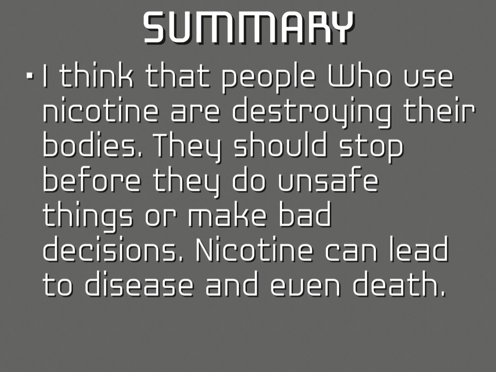 I think that people Who use nicotine are destroying their bodies. They should stop before they do unsafe things or make bad decisions. Nicotine can lead to disease and even death.
