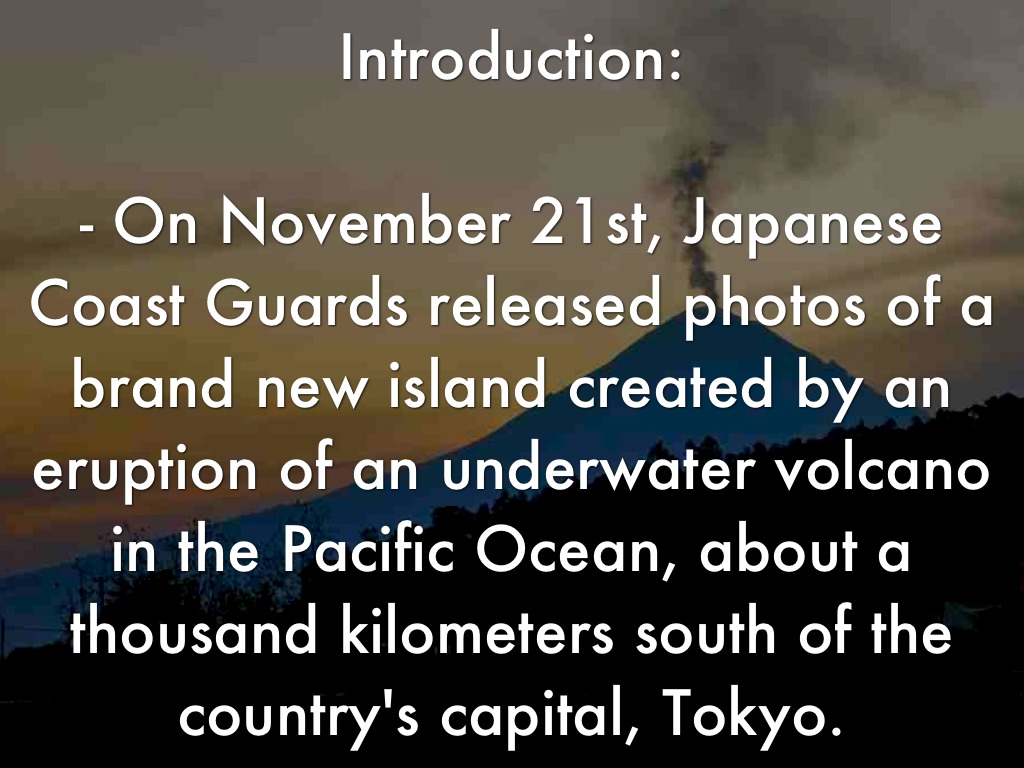 - On November 21st, Japanese Coast Guards released photos of a brand new island created by an eruption of an underwater volcano in the Pacific Ocean, about a thousand kilometers south of the country's capital, Tokyo.