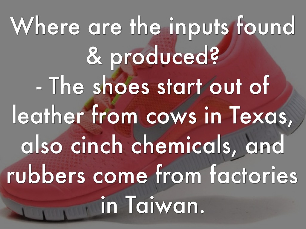 - The shoes start out of leather from cows in Texas, also cinch chemicals, and rubbers come from factories in Taiwan.