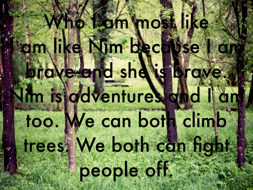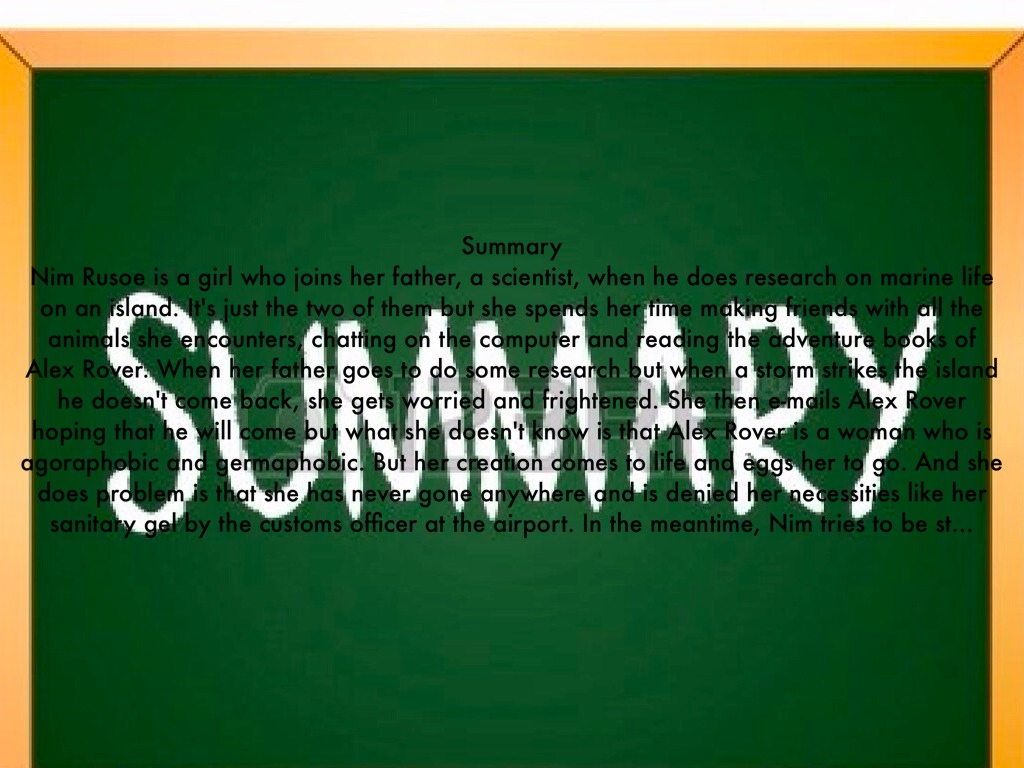 Nim Rusoe is a girl who joins her father, a scientist, when he does research on marine life on an island. It's just the two of them but she spends her time making friends with all the animals she encounters, chatting on the computer and reading the adventure books of Alex Rover. When her father goes to do some research but when a storm strikes the island he doesn't come back, she gets worried and frightened. She then e-mails Alex Rover hoping that he will come but what she doesn't know is that Alex Rover is a woman who is agoraphobic and germaphobic. But her creation comes to life and eggs her to go. And she does problem is that she has never gone anywhere and is denied her necessities like her sanitary gel by the customs officer at the airport. In the meantime, Nim tries to be strong while waiting for Alex to arrive.
