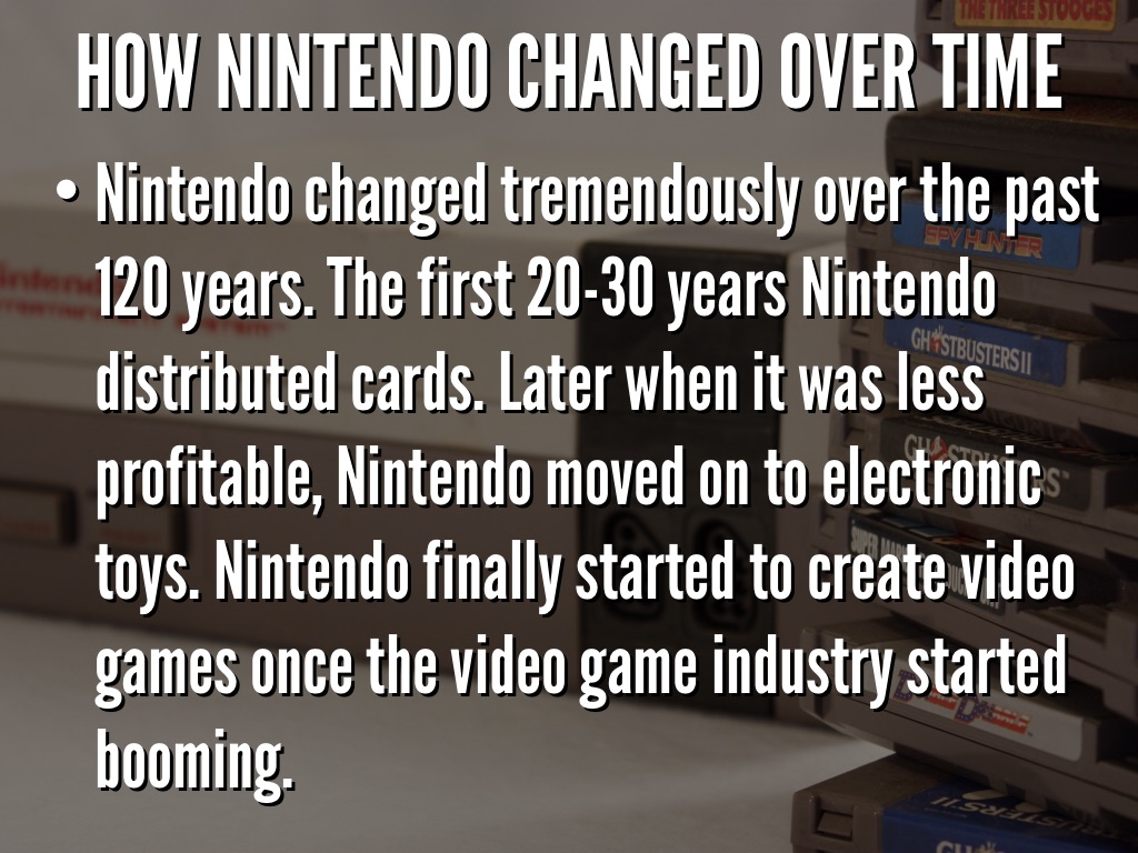 Nintendo changed tremendously over the past 120 years. The first 20-30 years Nintendo distributed cards. Later when it was less profitable, Nintendo moved on to electronic toys. Nintendo finally started to create video games once the video game industry started booming.