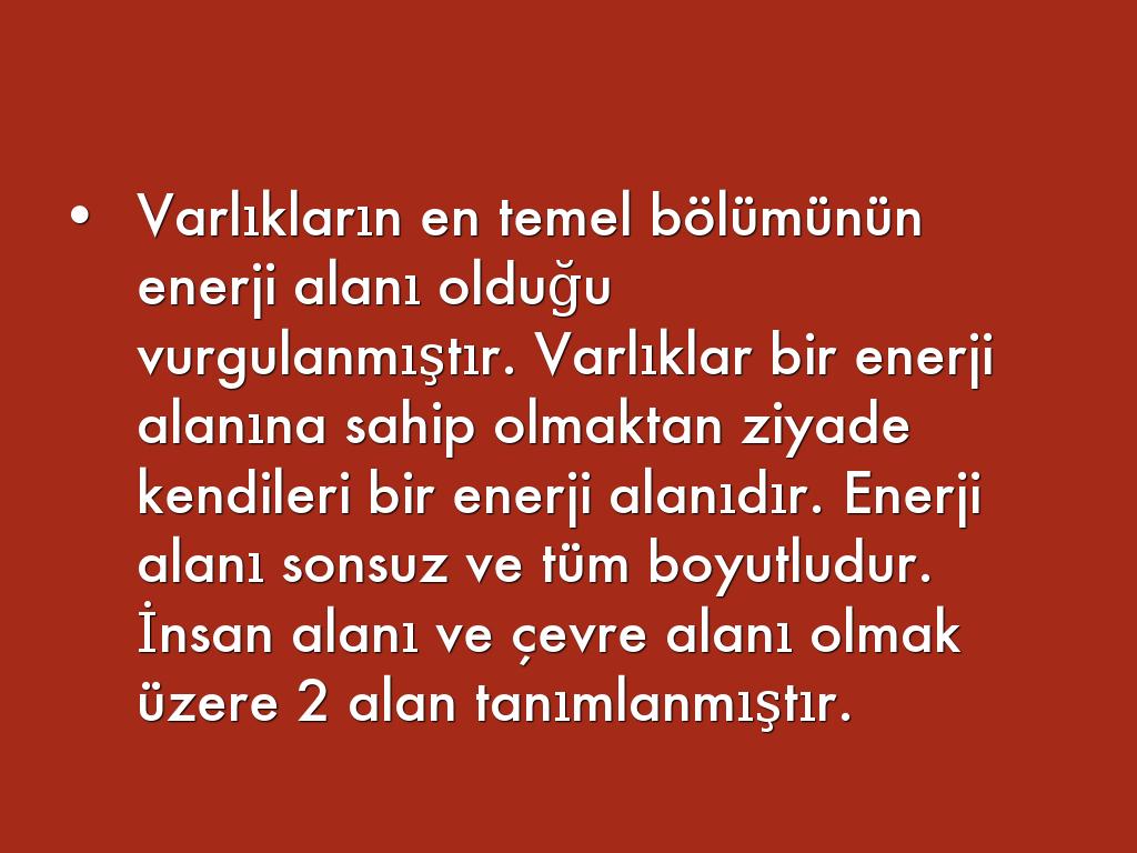Varlıkların en temel bölümünün enerji alanı olduğu vurgulanmıştır. Varlıklar bir enerji alanına sahip olmaktan ziyade kendileri bir enerji alanıdır. Enerji alanı sonsuz ve tüm boyutludur. İnsan alanı ve çevre alanı olmak üzere 2 alan tanımlanmıştır.