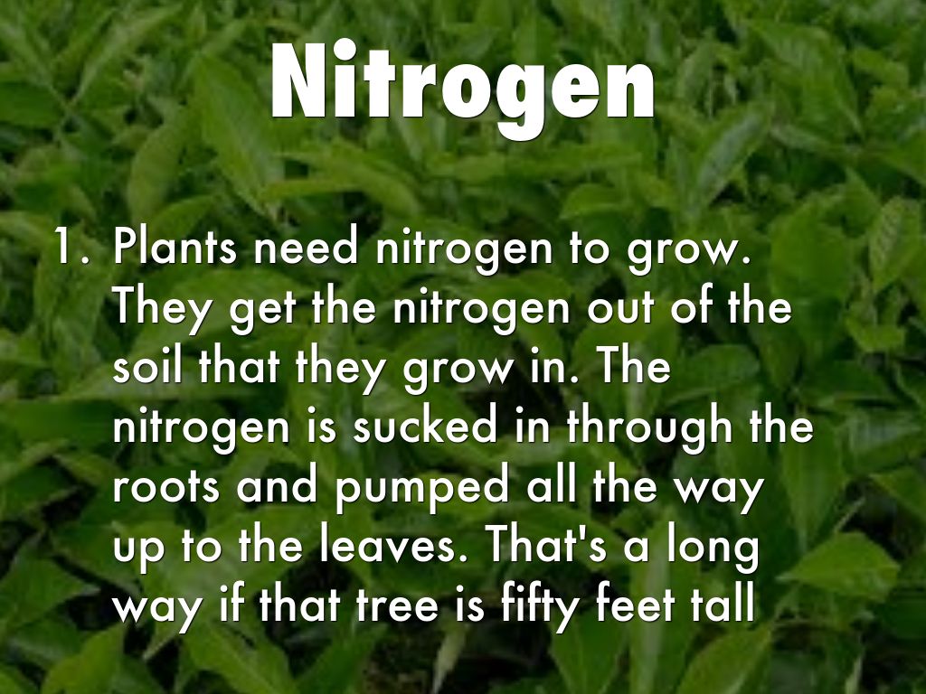 Plants need nitrogen to grow. They get the nitrogen out of the soil that they grow in. The nitrogen is sucked in through the roots and pumped all the way up to the leaves. That's a long way if that tree is fifty feet tall