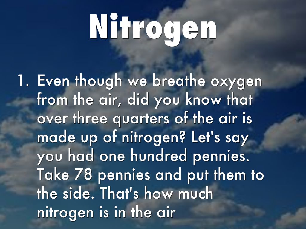 Even though we breathe oxygen from the air, did you know that over three quarters of the air is made up of nitrogen? Let's say you had one hundred pennies. Take 78 pennies and put them to the side. That's how much nitrogen is in the air