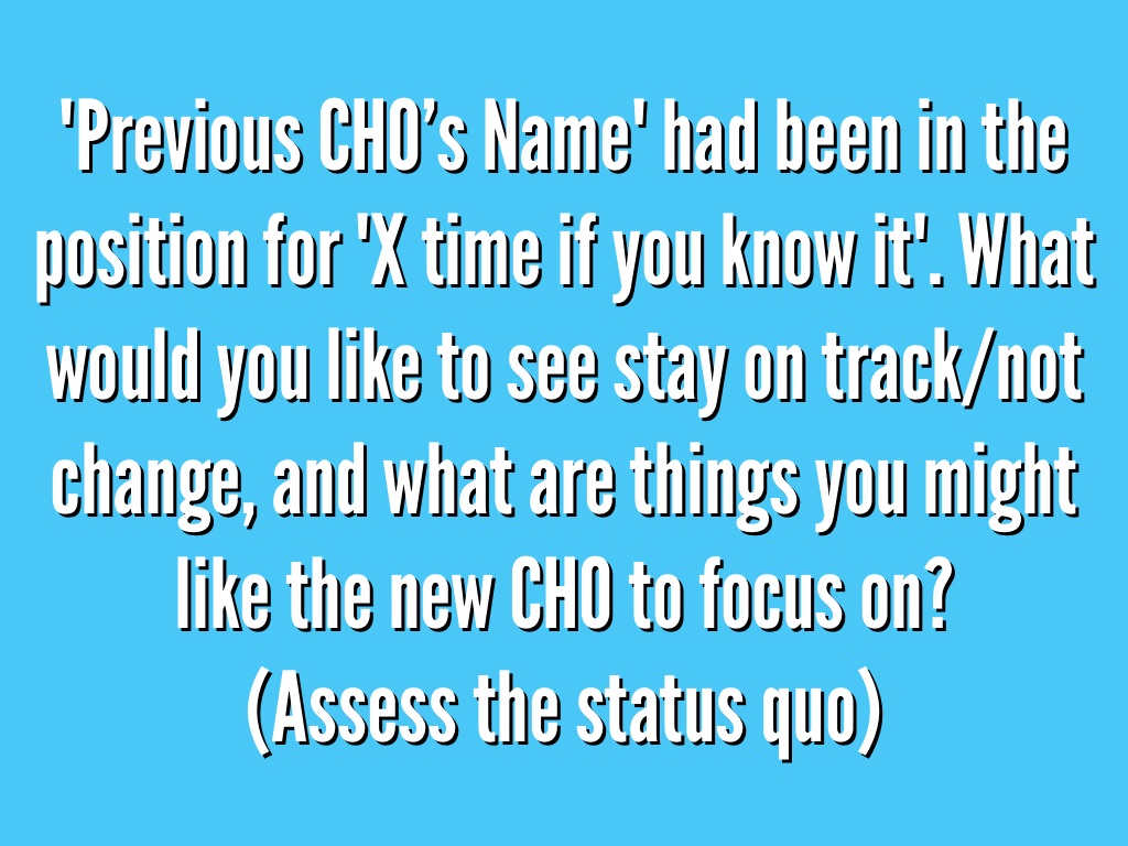 "Previous CHO's Name" had been in the position for "X time if you know it". What would you like to see stay on track/not change, and what are things you might like the new CHO to focus on?