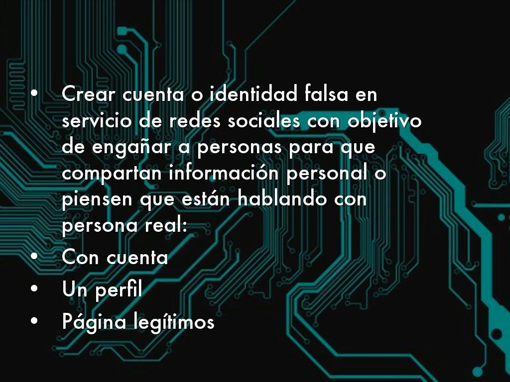 Crear cuenta o identidad falsa en servicio de redes sociales con objetivo de engañar a personas para que compartan información personal o piensen que están hablando con persona real: